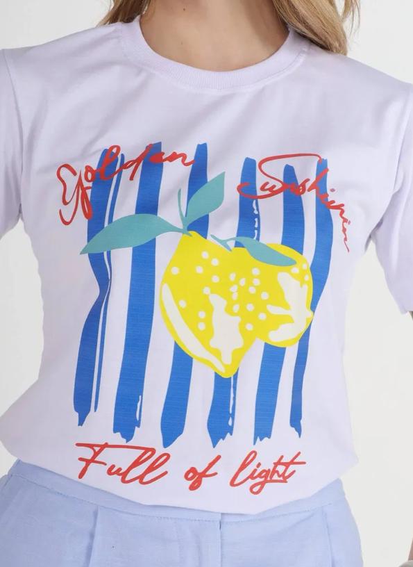 – Prefira a camiseta com estampa de limão siciliano combinada com peças em tons neutros (branco, areia, bege, cinza claro) para permitir que a estampa “exploda” sem competir com muitos elementos.